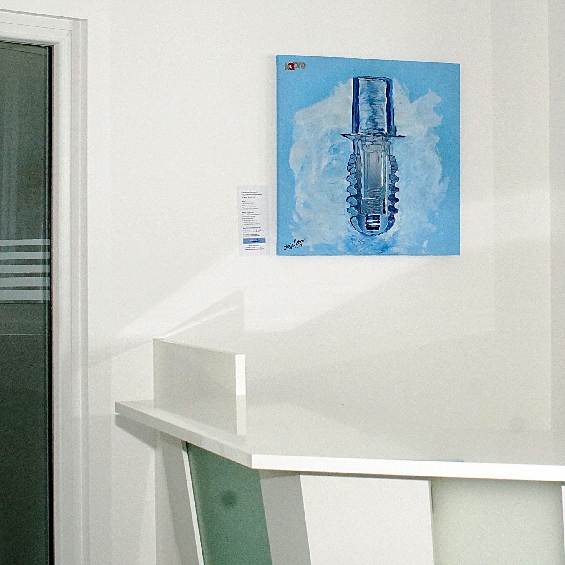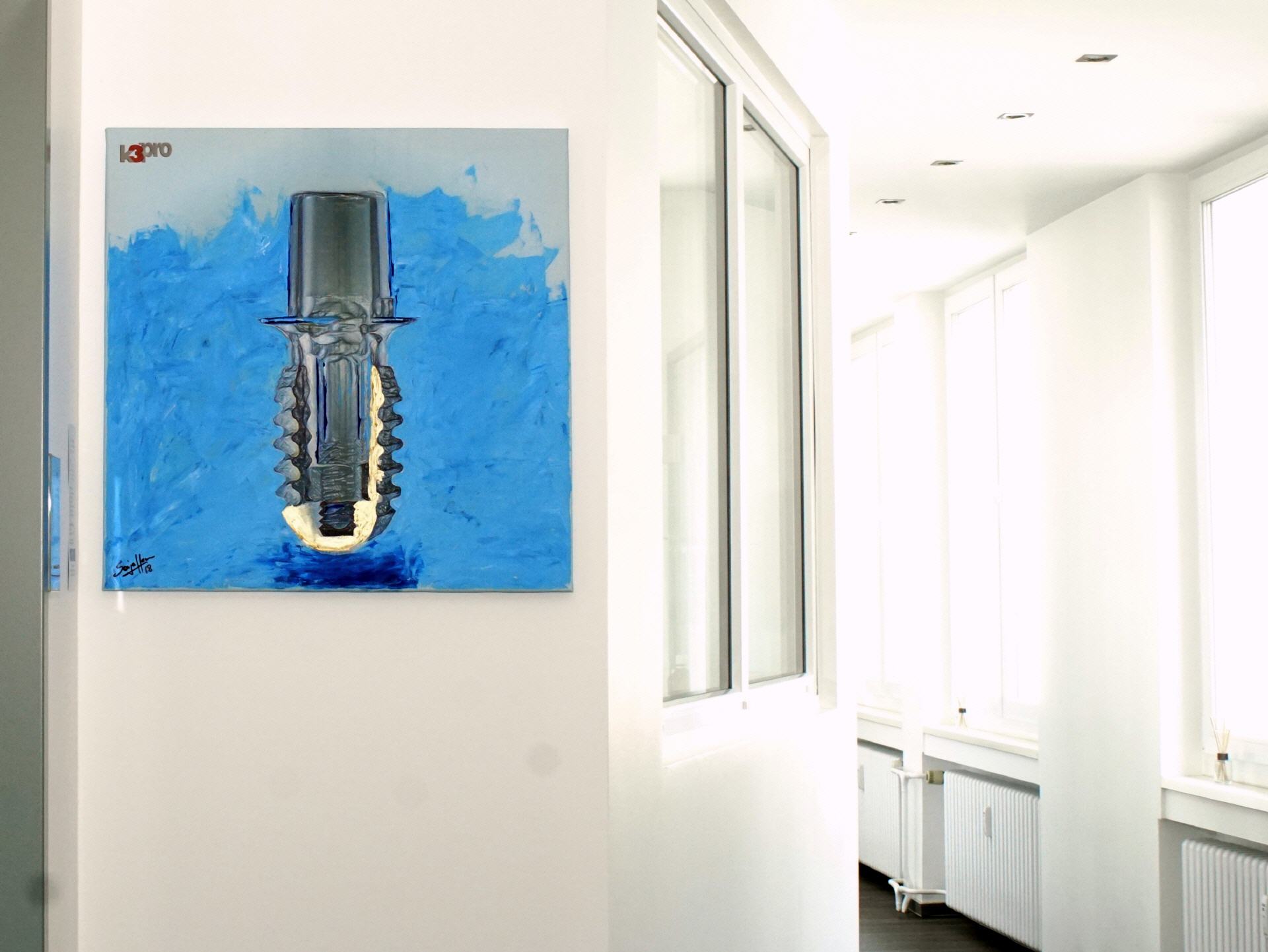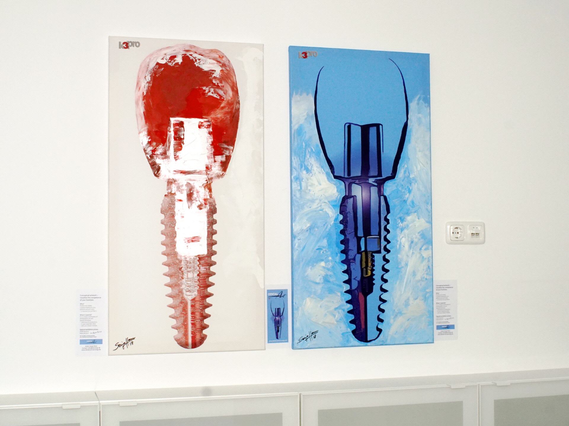 Die konzeptionelle Entwicklung dieser individuellen Exponate entstand in Zusammenarbeit mit dem internationalen Implantat Hersteller ARGON aus Bingen am Rhein. Die Künstlerin Sonja Henn setzte sich im speziellen mit dem Thema K3PRO Implantat auseinander. Die entstandenen Kunstwerke – jedes ein UNIKAT – wurden anhand des Originalbildmaterials des K3PRO Implantats fotodesignd und farblich verändert. Die eigentlichen 3-6mm großen Titanimplantate zeigen sich in neuen Farben und übergroßen Dimensionen. Dennoch bleibt der ursprüngliche Karakter unangetastet. Die Fotokunst wird auf Leinwand gebracht und partiell mit Acryl- und Ölfarbenfarben individuell mit Spachteltechnik von der Künstlerin bearbeitet.