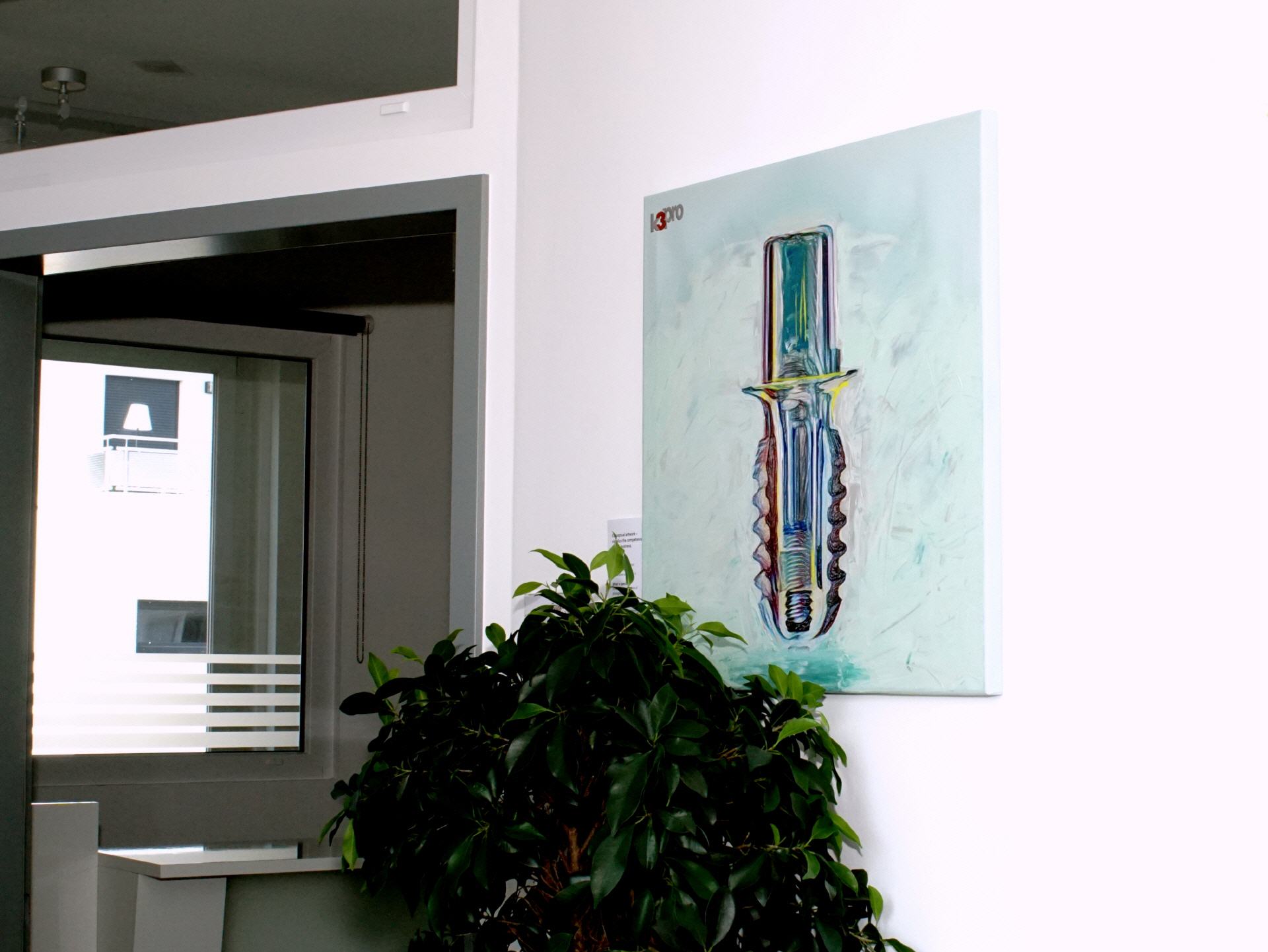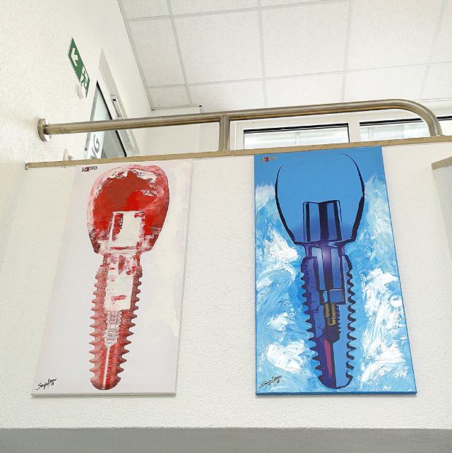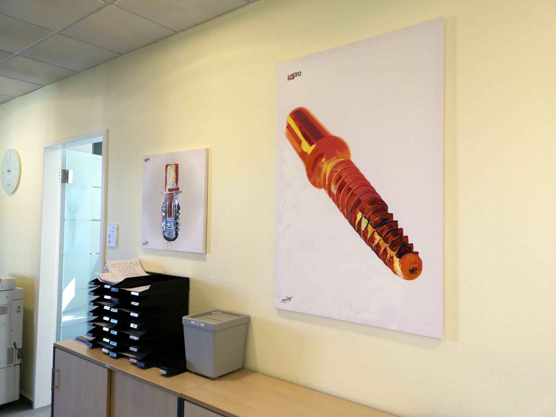 Die konzeptionelle Entwicklung dieser individuellen Exponate entstand in Zusammenarbeit mit dem internationalen Implantat Hersteller ARGON aus Bingen am Rhein. Die Künstlerin Sonja Henn setzte sich im speziellen mit dem Thema K3PRO Implantat auseinander. Die entstandenen Kunstwerke – jedes ein UNIKAT – wurden anhand des Originalbildmaterials des K3PRO Implantats fotodesignd und farblich verändert. Die eigentlichen 3-6mm großen Titanimplantate zeigen sich in neuen Farben und übergroßen Dimensionen. Dennoch bleibt der ursprüngliche Karakter unangetastet. Die Fotokunst wird auf Leinwand gebracht und partiell mit Acryl- und Ölfarbenfarben individuell mit Spachteltechnik von der Künstlerin bearbeitet.